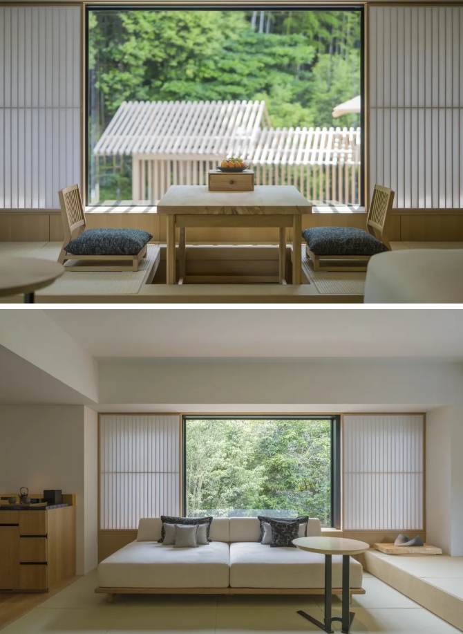京都东山悦榕庄的52 间客房室内设计延续了建筑外部的自然风格,融入了大量京都本地的传统元素,如榻榻米、天然木材和手工艺装饰。